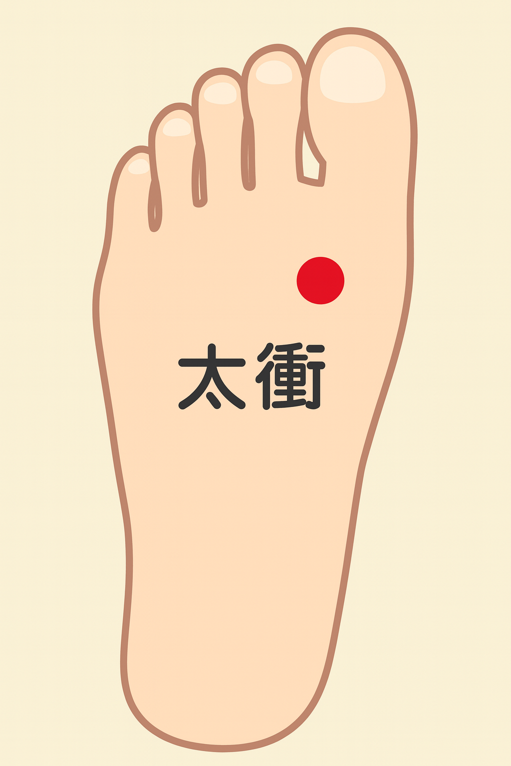 足の甲、親指と人差し指の骨が交わる部分。
