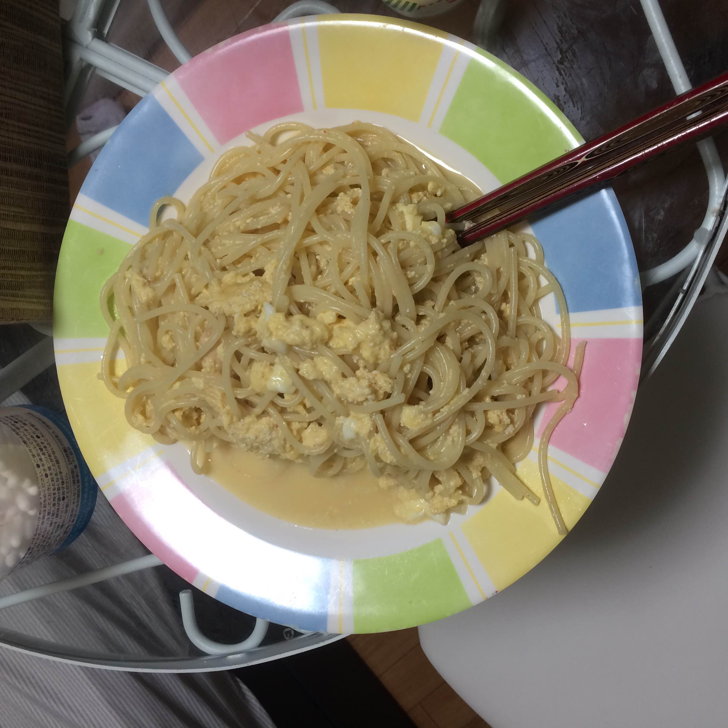 豆乳に明太子、卵を混ぜます!!事前にゆでていたパスタをフライパンで豆乳、明太子、卵のソースと混ぜます!!仕上げに塩コショウ・・・